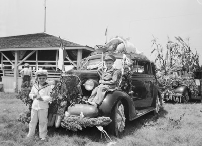 Johnson County Reunion. James Marks Walton, left, and Marion John Dean are shown in front of the car which displays farm products. Both of them are wearing military uniforms and holding flags. Marion is sitting on the car's hood holding a flag and James is standing in front of the car holding a flag. Published on August 7, 1941.