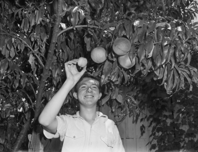 Verdell Eary is grinning as he displays the peaches growing in his backyard this summer. He is holding an ordinary peach next to the Texas peaches to demonstrate the size difference. Some of the peaches are 12 inches in diameter and weighed 15 ounces when picked. Verdell is the son of Mr. and Mrs. Joe Eary. He is dressed in a short-sleeve button-up shirt.