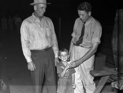 Jess Hennig and J. W. Vaughn, handing a drink of water to his son, James Edward. All of Olney. Young County citizens joined with Olney Friday night in playing host to the oil operators of that area at a barbecue held on the Olney High School football field. Published in Fort Worth Star-Telegram, morning edition, August 10, 1941.