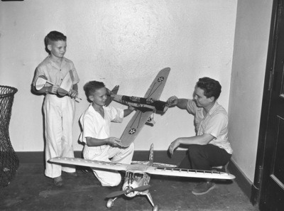 The members of the newly organized Fort Worth Aircraft Modelers Association, are demonstrating three types of model planes. The modelers, left to right, are Frank Schneller, Jack Schneller, and Roscoe Smith. Frank is holding a contest glider. He is dressed in a striped button-up shirt and trousers. Jack is displaying his flying scale, rubber powered ship. He is wearing a short-sleeve shirt and trousers. Roscoe is the president of the new association. He is kneeling beside his Stinson scale gas model plane. He is dressed in a short-sleeve shirt and trousers.