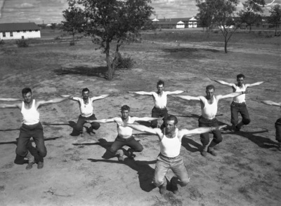 Lieutenant Jim Thomason leads his platoon in calisthenics at Camp Wolters. He and the other soldiers are wearing sleeveless shirts and trousers. They are exercising outdoors. In the background are several trees and buildings.