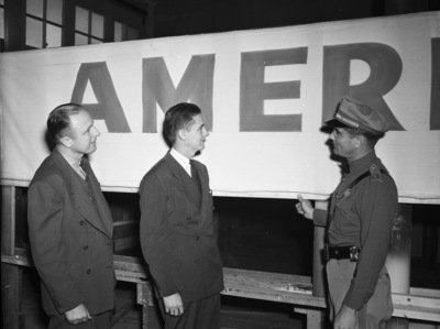 Three Jaycees are inspecting the Americanism Banner that hung across Main Street to call attention to Americanism Week. They are left to right, Charles Hillard, Dan Gould Junior, and Captain John Reed. Mr. Hillard is president of the Junior Chamber of Commerce, which is sponsoring the patriotic observance. He is wearing a double breasted three piece suit. Mr. Gould is dressed in a double breasted pinstripe suit. Captain Reed is a State Highway Patrol officer and chairman of the Americanism committee. He is wearing his patrol uniform. Published in the Fort Worth Star-Telegram evening edition, February 13, 1940.