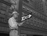 John Petroff, traffic equipment maintenance man holding a "One Way" sign.