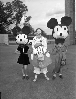 Recreation Department circus. Olin Eddleman, lanky clown, behind Donald Duck; Miss Patsy Totten hiding behind the Minnie Mouse head, and Eddie Hartzell in the head of Mickey Mouse. They are seen outside in their costumes.