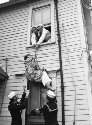 Using a French bowline, which also may be used as a breeches buoy, Scouts show how to remove a person from a damaged or burning structure. In the window (left to right) are LeRoy Odom and Royce Latimer. Edward Stark is the patient descending into the arms of Don Mason (left) and Tom Turner. Edward is wearing a striped robe and trousers. The other scouts are wearing their respective Sea Scout uniforms. All are from the Sea Scout Ship Vampyre of Polytechnic Methodist Church.