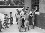 A group of Scouts from Troops 12, 15 and 17 demonstrate how to use a stretcher and the proper way to remove an injured person from a building in which exits are blocked by debris. They have improvised a stretcher from a blanket and two Scout staffs. One scout is inside the building, at the window, and the rest are outside holding the stretcher. A group of young children are standing at the far left, watching the demonstration.