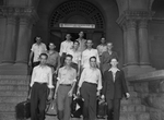 Texas recruits are leaving for duty with the Air Corps to Ellington Field, in Houston, Texas. The twelve brand new soldiers are shown standing on the steps of the United States Army recruiting office building in Fort Worth, Texas. They are, left to right, on the front row, Lathie E. Jarrell (Stephenville, Texas), Olen C. Christie (Mineral Wells, Texas), Jerry M. Parnell (Stephenville), and Richard L. Keagle (Fort Worth). On the middle row are Fay Groom (Fort Worth), Charles Trimble (Stephenville), Thomas B. Connell Junior (Fort Worth), and O. D. Bounds Junior (Fort Worth). On the back row are Boyd Woodall Junior (Mineral Wells), Charles D. Edmondson (Mineral Wells), O. W. Latham (Springtown, Texas), and Harlan Vess (Springtown). The recruits are carrying their suitcases as they embark for training.