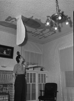 Mrs. Earl Sain is examining the leaky ceiling in the middle of her living room. The roof of her home was damaged when a storm knocked over a utility pole and the falling pole punched a hole in her roof. Mrs. Sain is extending her hand to catch the dripping water. She is dressed in a polka-dot blouse and trousers. There is a fireplace and a bookcase on the back wall.