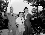 Mr. and Mrs. George Wynne and their son, George Junior, are visiting Fort Worth, Texas, from Hampton, Virginia. This trip marks their first visit to Texas. They are the guests of Mr. and Mrs. H. T. Davis. Mrs. Wynne and Mrs. Davis are cousins. Mr. Wynne is dressed in a double breasted suit with a handkerchief in the pocket. George Jr. is wearing a collared shirt, necktie, and shorts. Mrs. Wynne is dressed in a collared blouse, blazer, and a skirt. The family is standing between a trellis in the garden.