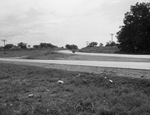 Scene of an accident at the intersection of Highways 183 and 121, near Birdville, Texas. The view is of the empty road. There are telephone poles and trees in the background. Mrs. Johnnie Lee King, Private Clifford Miller and Mrs. Velma Lee Stone were killed in the accident.