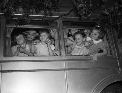The Southwestern Home and School for Orphans is visiting Fort Worth, Texas, from Itasca, Texas. Approximately 100 children were brought for an outing to the Forest Park Zoo. Two sets of sisters are shown waiting in the automobile. They are, left to right, Esta Margaret Weaver, Doris Weaver, Joyce Marie Neal, and Alma Lee Neal. The children are being entertained by the Broadway Presbyterian Church while they wait out the rain.