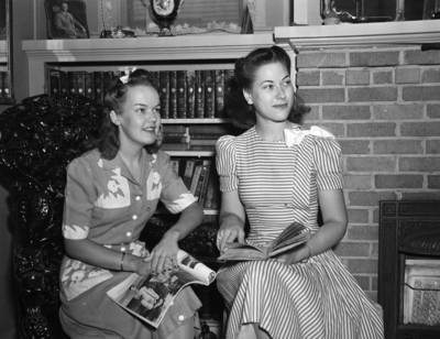 Visiting Fort Worth, Texas, during their summer vacation, left to right, are Miss Virginia Lee Jones and Miss Pan Greenwall. They both live in Columbus, Ohio. They are shown sitting in front of a fireplace, reading magazines. Miss Greenwall is visiting her parents, Mr. and Mrs. Mitchell W. Greenwall. She is wearing a striped dress. Miss Jones accompanied her friend on the trip. She is wearing a button-up dress. There is a bookshelf in the background.