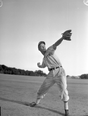 Amateur baseball player Sammy Jackson, pitcher for the National League. Mr. Jackson is shown standing with his legs spread apart, his left arm extended and his right arm pulled back. In his right hand is a baseball and he is wearing a baseball glove on his left hand. He is wearing a baseball uniform that includes his team's jersey and a cap.