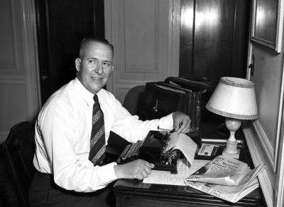 Ed Riedel of San Angelo, state commander of the American Legion, writes his annual report in his hotel room on a portable typewriter, 08/15/1941