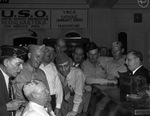 American Legion Convention. The pianist is J. J. Faulkner of Cameron, Oklahoma. Others in group are C. W. Bradley, Tyler, Texas, Private Paul F. (Pinky) Johnson, Youngtown, Ohio; Don Ferris, Munday; Chuck Borson, Hindsdale, Illinois. Flake George, Shamrock; Sergeant Charles J. Beauman, Dayton, Ohio; Coy C. Arledge, Cameron, Oklahoma D. Shields, Evansville, Indiana, and Louis Richker, Fort Worth, Texas.