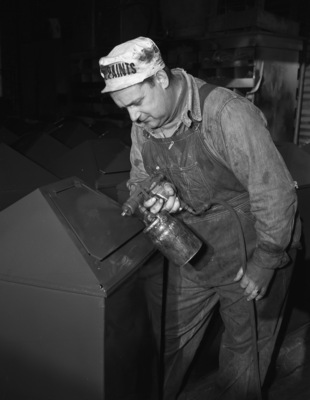 O. R. Howell, service man, is participating in a city wide announcement to keep the streets clean. He is shown painting a trash can olive green at a city garage. "Please help keep your city clean" will also be painted on the trash can. The receptacles will be placed on each corner of the twenty-four intersections on Main and Houston Streets. Mr. Howell is wearing a painter's cap, button-up shirt, and overalls. Published in the Fort Worth Star-Telegram morning edition, February 14, 1940.
