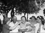Potato salad was a popular dish at the picnic of the Fort Worth Advertising Club and the Dallas Advertising League at Arlington, Texas. Left to right, Mrs. Marsline Moore, Fort Worth, Texas; T. L. Jaggar, Dallas, Texas; Mrs. Jaggar; Mrs. Flora Brown, Fort Worth, Texas; and Mrs. Charles C. Johnson Junior, Fort Worth, Texas. In the picture you can see Mrs. Jaggar being fed by Mrs. Moore. Published in the Fort Worth Star-Telegram morning edition, August 18, 1941.