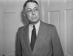 Major A. C. Bradley, the constructing quartermaster, is speaking with members at a conference. They are discussing arrangements for a speedy start toward construction of a two-million-dollar North Texas Quartermaster Depot in Fort Worth, Texas. Major Bradley will meet with the architect firm Gill & Bennett to discuss choosing the appropriate site for the depot. Major Bradley is standing in front of a door, dressed in a suit.