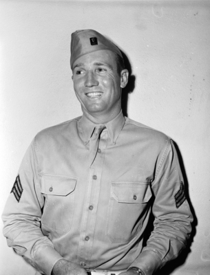 Sergeant Vernon Wood is serving with the United States Army in the 37th Infantry. He is stationed in Hawaii and is in Fort Worth, Texas, on a furlough. Sergeant Wood is better known as "Red," the star fullback on the 1936 Arlington Heights football team. While in the Army, he still plays football regularly against other service teams. He hopes to continue his football career after military service. At six feet tall and 190 pounds, the 21-year-old plans to play end in college. Sergeant Wood is standing against a wall, dressed in his military uniform.