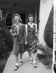 Helen Copeland, left, and Nadeen Briggs will be roommates at the University of Texas when they leave later in the month for the fall semester. They are walking down the sidewalk in front of Miss Copeland's home, with books in their arms. Miss Copeland is wearing a button-up blouse, blazer, and a skirt. Miss Briggs is dressed in a collared shirt, vest, and a checkered skirt.