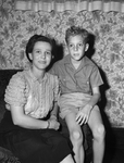 Mrs. J. P. Howard and her son, Douglas Howard, were recently evacuated from Manila, Philippines. Her husband remained in the Philippines, where they lived for six years. The mother and son are staying with Mr. Howard's mother, Mrs. J. E. Howard, in Fort Worth, Texas. Mrs. J. P. Howard is sitting on a chair, wearing a frilly blouse and a dark skirt. Eight-year-old Douglas is dressed in a button-up shirt and shorts.