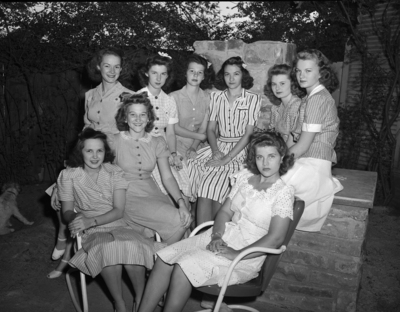 New officers of Sigma Sigma Sigma Sorority are being installed at a banquet at the Colonial Country Club. On the front row, left to right, are Reta Adams (vice president), Marjorie Johnson (treasurer), and Betty Jo Zachary (president). On the back row, left to right, are Mary Helen Stuart (business and publicity manager), Martha Allen (historian), Anne Burkett (recording secretary), Jean Gilliland (parliamentarian), Patty Cosby (corresponding secretary), and Frances Ann Miller (sergeant-at-arms). There is a dog sitting in the background behind the girls.