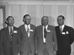 Texas Cotton Ginners Association is meeting for a two-day convention at the Hotel Texas. In a attendance are left to right, E. E. Richardson, Rhome, Texas; C. G. Emmons Senior, Keller, Texas; W. I. Bishop, Justin, Texas; and John C. Thompson, Dallas, Texas. Mr. Richardson, of Rhome, Texas, is wearing a suit with the jacket unbuttoned. Mr. Emmons is from Keller, Texas. He is dressed in a suit. Mr. Bishop, of Justin, Texas, is dressed in a pinstripe suit. Mr. Thompson is from Dallas, Texas. He is wearing a dark, double breasted suit with a pocket square. All four men are wearing name tags.
