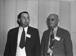 Texas Cotton Ginners Association is meeting for a two-day convention at the Hotel Texas to discuss this years cotton crop. In a attendance are left to right, C. G. Emmons Junior and J. A. Fuston. Mr. Emmons is from Keller, Texas. He is dressed in a pinstripe suit with a nametag on the lapel. Mr. Fuston, Italy, Texas, is dressed in a suit with a nametag.