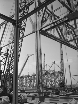 The photograph shows the steel framework of the main assembly building at the Lake Worth bomber plant.