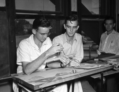 Thursday's graduating class in aviation draftsmanship includes these two young men. Pictured left to right are Jerald Richardson and George Louden, both of Fort Worth, Texas. They completed a 13-week course offered to them without cost, through the defense training program. A large number of students who complete the course step directly into defense jobs. Mr. Richardson is dressed in a short-sleeve shirt. Mr. Louden is wearing a striped button-up shirt.