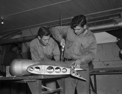 Learning the fine points of aircraft sheet metal work are these two young West Texans. They are in their third week of a course in defense training classes offered in Fort Worth, Texas. Pictured left to right are Guy Matlock and O. L. Matlock, both of Antelope, Texas. The cousins are shown riveting a miniature wing section of a bomber. They are both dressed in button-up shirts and trousers.