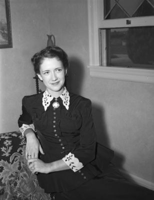 Mrs. Kathleen Patricia Wyse and her husband, S. L. Wyse Junior, are making their home in Fort Worth, Texas. Mrs. Wyse, formerly Miss Meagher, is a native of West Frankfort, Illinois. She is shown sitting on a chair in their new home. She is wearing a button-up blouse with an eyelet design on the collar, a skirt, and a brooch. A window is open behind her.