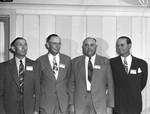 Image shows Texas Cotton Ginners Association is meeting for a two-day convention at the Hotel Texas. In a attendance are left to right, E. E. Richardson, Rhome, Texas; C. G. Emmons Senior, Keller, Texas; W. I. Bishop, Justin, Texas; and John C. Thompson, Dallas, Texas. Mr. Richardson, of Rhome, Texas, is wearing a suit with the jacket unbuttoned. Mr. Emmons is from Keller, Texas. He is dressed in a suit. Mr. Bishop, of Justin, Texas, is dressed in a pinstripe suit. Mr. Thompson is from Dallas, Texas. He is wearing a dark, double breasted suit with a pocket square. All four men are wearing name tags. Published in the Fort Worth Star-Telegram morning edition August 22, 1941.