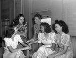 Left to right are Phyllis O'Brien, Martha McCracken, Anne Campbell, Ann Newton and Bobie Billingsley, who are on a committee to recruit Fort Worth, Texas, young women for United Service Organization (U. S. O.) dancing partners. The next U. S. O. dance will be held on August 30. Miss O'Brien is wearing a blouse and a striped skirt. Miss McCracken is wearing a floral print dress. Miss Campbell is wearing a striped dress. Miss Newton is wearing a dress with a geometric pattern along the neckline and bottom hem. Miss Billingsley is wearing a floral print dress.