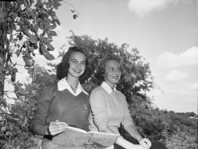 Two graduates of Arlington Heights High School are shown looking through the 1941 Yellow Jacket yearbook. The girls, left to right, are Miss Rose Ann Pearson and Miss Lory Friedman. Miss Pearson is the daughter of Mr. and Mrs. Russell Pearson. She will be attending Gulf Park College in Gulfport, Mississippi. She is wearing a collared blouse and a sweater with a house brooch. Miss Friedman is the daughter of Mr. and Mrs. H. B. Friedman. She will be attending Stephens College in Columbia, Missouri. She is dressed in a collared blouse and a sweater.