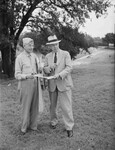 Major Robert M. Patterson, commander of Fort Worth Recreational Area, as he studied the layout with Park Superintendent Adams of the six-acre site of a rest camp to be constructed in Sycamore Park for visiting soldiers. The two men are standing outside in a field with a few trees in the background. Major Patterson is wearing a military uniform and Superintendent Adams is wearing a suit and hat. Major Patterson has a large file filled with papers tucked under his left arm.
