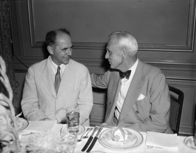 A luncheon is being held at the Fort Worth Club to honor a South American leader. Sitting at a table, left to right, are Dr. Federico Pinedo and Marshall A. Fuller. Dr. Pinedo is the former minister of finance in Argentina. He is dressed in a light colored suit. Mr. Fuller is the president of Fort Worth Clearing House Association. He is dressed in a double breasted suit with a bow tie. The men are discussing banking while they eat lunch.