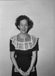 Miss Betty Jane Sharp, of Dallas, Texas, is a Girl Reserve secretary of the Young Women's Christian Association (Y. W. C. A.). She has been visiting her sister, Miss Martha Sharp, in Fort Worth, Texas. Betty Jane is shown standing against a wall. She is wearing a dark dress with a lace collar and pockets.