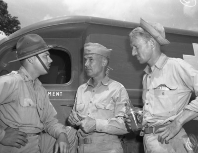 Ward, Claud, Jr. (Capt.); Parnell, Red W. (Sgt.); Bunch, Thomas (Pfc.); Military personnel; Military uniforms; Beverages; Automobiles; Military maneuvers; Military life