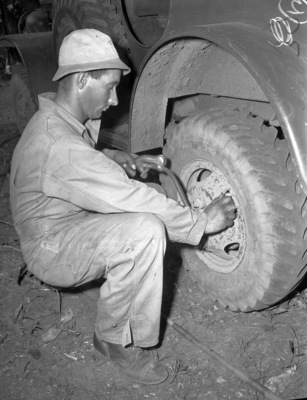 Private First Class Charles F. Fenton, of Fort Worth, Texas, airing a tire on a reconnaissance vehicle. Private Fenton belongs to the Headquarters Company of the 144th Infantry. He is knelt down next to the flat tire, adjusting the air pump to the tire. He is wearing coveralls and a bucket hat.