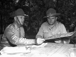 Colonel Nat S. Perrine (left) of Austin, Texas, and Captain Andrew Price, of Fort Worth, Texas. The two men are sitting at a wooden table with clipboards and other papers. Captain Price is holding a board up for Colonel Perrine to examine. Colonel Perrine is commander of the 142nd Infantry. Both men are wearing military uniforms and brimmed hats strapped to their chins. Behind them are several trees.