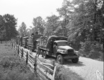Supply trucks for the 124th Regiment driving down a dirt road near a forest. On the backs of the trucks, several soldiers can be seen seated or standing. On the other side of the dirt road (left) is a wooden fence.