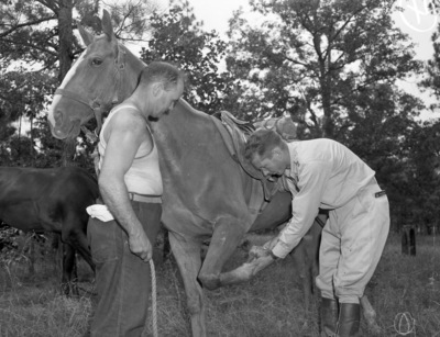 Captain Sam L. Hunnicutt, of Fort Worth, Texas, right, liaison officer of the 56th Cavalry, examines the hoof of his crack horse "Sun-Up," as Stable Sergeant W. T. Harwood, of Van Buren, Arkansas, holds the horse. Captain Hunnicutt is dressed in military uniform while Sergeant Harwood is wearing a tank-top tucked into trousers. Sergeant Harwood is also holding a rope in his other hand, as Captain Hunnicutt examines the horse. Another horse can be seen standing behind "Sun-Up" at left.