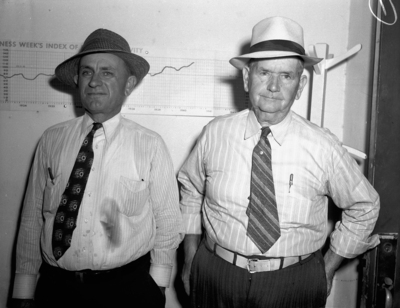 A pool of oil was recently discovered in Mitchell County, near Colorado City, Texas. Responsible for the renewed activity in Mitchell County, left to right, are R. T. Dockrey and B. F. Robbins. They are the men that discovered the pool that now bears their names. Mr. Dockrey is a native of Colorado City. He is dressed in a hat, button-up shirt, necktie, and trousers. Mr. Robbins is from Big Spring, Texas. He is wearing a hat, striped shirt, necktie, and trousers. There is a chart hanging on the back wall, tracking weekly index of activity.