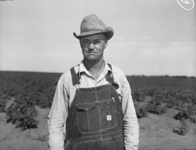A pool of oil was recently discovered in Mitchell County, near Colorado City, Texas. E. T. Strain is the owner of the land on which the discovery well was drilled. He is shown standing outside on his property. He is dressed in a cowboy hat, button-up shirt, and jean overalls.