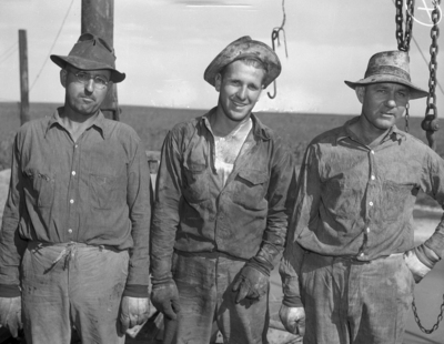 A pool of oil was recently discovered in Mitchell County, near Colorado City, Texas. The land where the discovery is being drilled is owned by E. T. Strain. One of the drilling companies in the county is the C. L. Echols Company. Working on the Number 2-A C. C. Crawford are three members of the crew. The drilling crew, left to right, are Fred Dodson, Hugh Brown, and C. R. Grantham. Mr. Dodson is a casing man. He is dressed in a hat, button-up shirt, and trousers. Mr. Brown is a tool dresser. He is wearing a floppy hat, t-shirt, button-up shirt, trousers, and gloves. Mr. Grantham is a driller. He is dressed in a straw hat, collared shirt, and trousers.