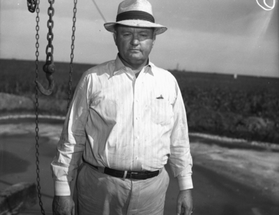 A pool of oil was recently discovered in Mitchell County, near Colorado City, Texas. The land on which the discovery well is being drilled belongs to Mr. E. T. Strain. One of the active companies in the county is the Echols Drilling Company. Jess Wilbanks, the foreman for Echols is shown working on Number 2-A C. C. Crawford. He is dressed in a fedora, striped button-up shirt, and trousers.
