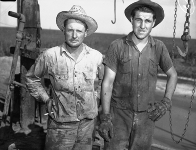 A pool of oil was recently discovered in Mitchell County, near Colorado City, Texas. The land where the discovery is being drilled is owned by E. T. Strain. One of the drilling companies in the county is the C. L. Echols Company. Shown working on the Number 2-A C. C. Crawford, left to right, are J. L. Joner and Bert Brown. Both work on the crew as casing men. Mr. Joner is dressed in a straw hat, button-u shirt, and trousers. He is smoking a cigarette. Mr. Brown is wearing a hat, short-sleeve shirt, trousers, and gloves.
