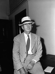 F. J. Von Zuben is a consulting engineer from Fort Worth, Texas. He has been contracted to prepare community plans for an upcoming project in Valley Mills, Texas. The United States Army is constructing a camp in the city that will cost 22.5 million dollars. Mr. Zuben is shown sitting on the edge of a desk with a notepad nearby. He is dressed in a hat and a light colored suit.