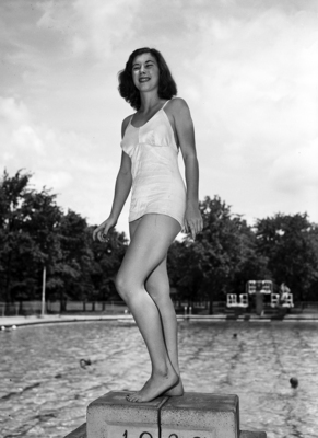 Swimmers. Image of Colleen Fraley. She is standing on top of a concrete block that reads 1938.